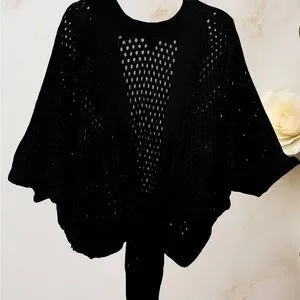 Black Open Knit Poncho with Batwing Sleeves