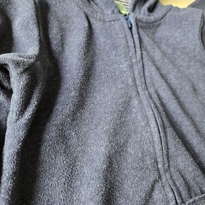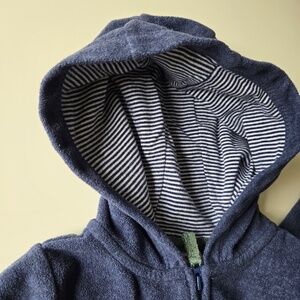 Front zipper. Long Sleeves. Cuffed on wrist and ankles. Stripes inside hoodie. Front pockets.