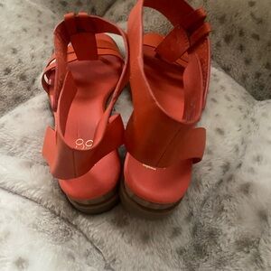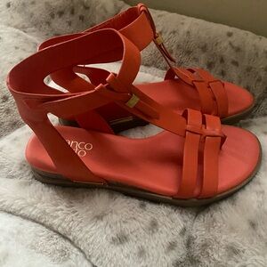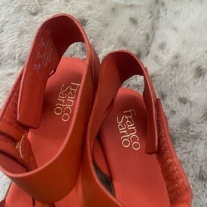 These vibrant red sandals by Franco Sarto feature a chic T-strap design with multiple thin straps for a stylish geometric look. The ankle strap with a buckle closure provides a secure fit, while the flat sole ensures comfort for everyday wear. Crafted from a leather-like material, they are a bold addition to any summer outfit.