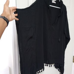 The Loves Titch Black Fringe Edge Poncho, size L, is a stylish and versatile piece for beach and poolside wear.