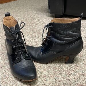 Crafted from premium black leather, these John Fluevog lace-up boots exude a timeless vintage appeal. Featuring a rounded toe and a modest curved heel, they offer both style and comfort. The intricate lace-up design and subtle sheen make them a standout addition to any footwear collection.