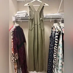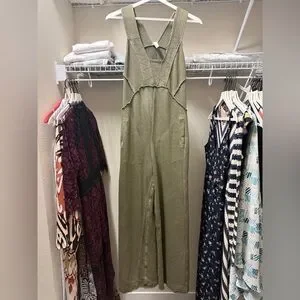 This Anthropologie jumpsuit in a muted green hue features a V-neckline and a relaxed wide-leg silhouette, offering a blend of comfort and contemporary style. The thin shoulder straps and soft fabric make it a versatile piece for casual outings or dressed-up occasions.