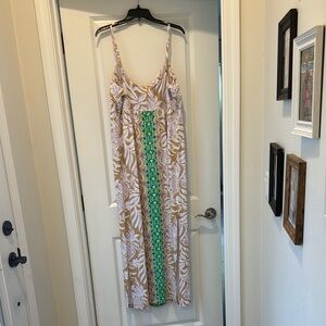 Embrace the essence of resort wear with this stunning Lilly Pulitzer sundress. Featuring a sleeveless design with adjustable spaghetti straps, built in bra and gold zipper in the back, this maxi dress showcases a vibrant green and tan pattern that exudes elegance and charm. Perfect for warm weather, its flowing silhouette offers both comfort and style for any sunny getaway.