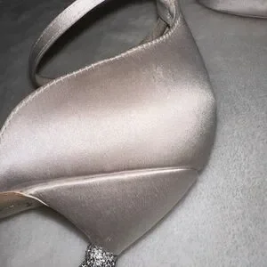 However, as you can see in the pictures, they’ve never been worn please turn to pictures and notice a bit of color change I believe it’s the glue in the very front of the peep toe on the edge of the rhinestones. I promise it’s barely noticeable. There are no crystals nor pearls missing. The satin does have a little bit of a buff off (please turn to last pictures)