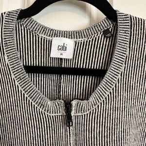 Elevate your wardrobe with the Cabi Shark Bite Navy and White Cardigan, featuring a chic open front design and a relaxed fit. This stylish sweater combines comfort and elegance, making it a versatile addition to any outfit. Has a zipper front. Zipper can be worn front or back. Ties on each side. EXCELLENT used condition, pet and smoke free home. No stains or signs of wear.