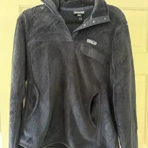 Warm fleece pullover by Patagonia. Features snap collar and front pocket.