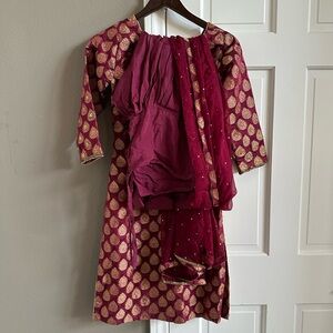 Beautiful red dress with gold patterns. Features intricate detailing at the hem. Punjabi dress with pants and sash