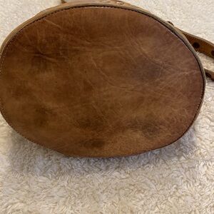 Stylish brown leather bucket bag by Bed Stu with studded details. Pen mark on front. Excellent used condition other than the pen mark. Divider inside with zippered pocket. I got comments on this bag everywhere I went.