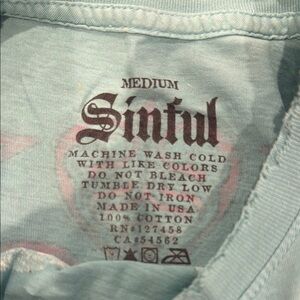 This Sinful tee showcases a vibrant blue hue, crafted from soft cotton for a comfortable fit. The short sleeves and classic crew neckline make it a versatile addition to any casual wardrobe. A striking graphic design on the front adds a unique touch to this stylish top.