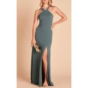 Chic and versatile, the Birdy Grey Gene dress in Crepe Sea Glass is a bridesmaid favorite designed for comfort and style. This sleeveless floor-length gown features a contemporary halter-style neckline with wide straps and a flattering A-line silhouette. The crepe fabric offers a subtle stretch, and the front slit adds graceful movement for dancing or walking down the aisle.
