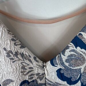 Dress the Population dress. White with blue and gold floral. Sleeveless. Brocade. Zips on back. Sheer insert on front. Cocktail style. Polyester. New with tags. Size small.