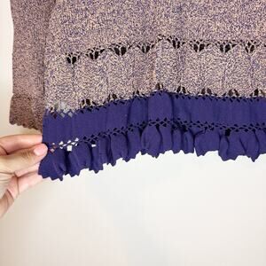 The Katja Tunic is made from a medium-weight stretchy yarn that combines two tones of purple (one with tan undertones) with a solid highlight edged trim. This knit tunic has an elegant silhouette that fits close to the body, and features a high neck, elongated sleeves and textural hand crochet hemline.