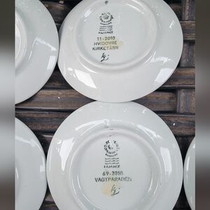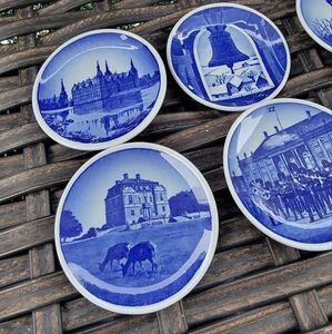 Set of six blue and white decorative plates with intricate designs. Perfect for display or collection.