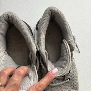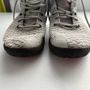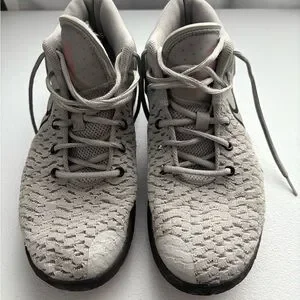 Nike KD high-top sneakers in light gray. Only worn on the court. Missing the inserts, my son had ones he bought in them. Only worn for one season. Still great shape.