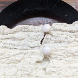 Romantic and modern, this ivory sleeveless top from All:Row features a richly textured, smocked-style fabric with delicate ruffle edging at the neck and armholes. Lightweight and stretchy for a flattering, comfortable fit. Includes a side button closure detail and extra buttons in a pouch.