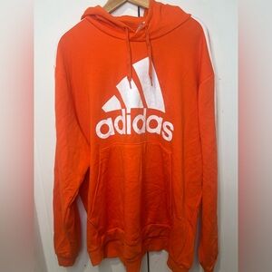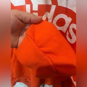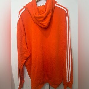 This vibrant orange Adidas sweatshirt features the iconic three white stripes along the sleeves and a bold white logo on the chest. Designed with a classic athletic style, it offers a comfortable fit with its cotton/polyester blend fabric. Perfect for adding a sporty touch to your casual wardrobe.