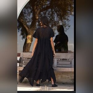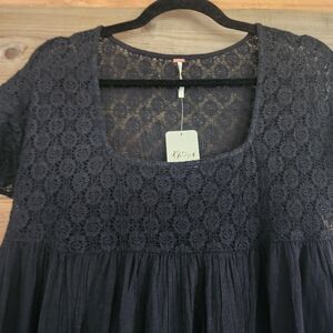 Romantic and ethereal, this sweet midi from our free-est collection is a true throw-on-and- tr go staple. *it:** Shapeless, babydoll- nspired silhouette *Features:** Square neckline, embroidered lace piecing, ruffle trimming throughout, back tie closure, flutte sleeves *Why We lt: * Laid back with sporty sneakers or elevated with sleek platforms, this style has endless ways to wear.