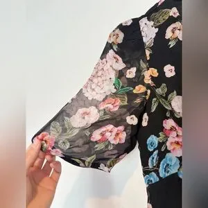 adorned in roses, pansies and hydrangeas. Sheer black flower pattern with black slip underneath. V neck and keyhole back. By Maeve.