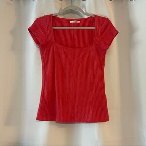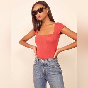 Reformation Jeans Bardot Ribbed Knit Top. Soft and comfy, color resembles a coral