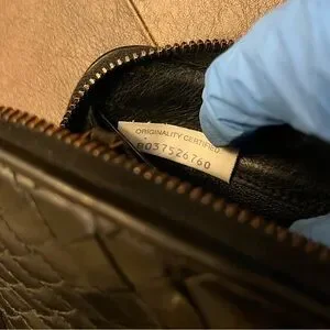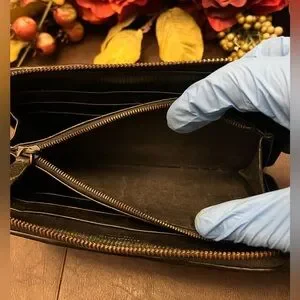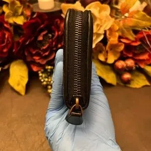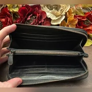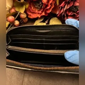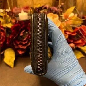 The wallet as a whole is in really good condition. There is minor rubbing/wear to the outer zipper. General wear throughout the wallet. Minimal fading of leather. Slight/Not noticeable coin residue. 100% Authentic