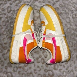 Stylish Nike women's sneakers. Features vibrant yellow and pink accents. Comfortable and trendy design.