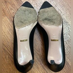 Black Leather Slip-on Pointed Toe Heels with Gold Stud details at Toe