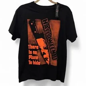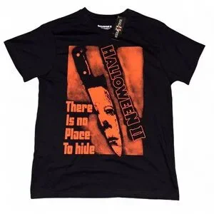 Black t-shirt featuring a bold orange Halloween II Michael Myers graphic. Perfect for fans of the classic horror film. Brand new with tags. Size medium.