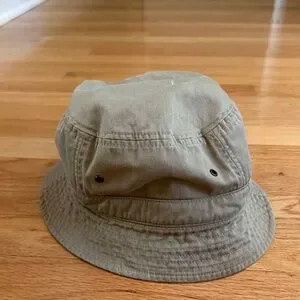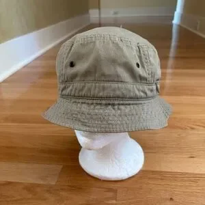 Duluth Trading Co Bucket Hat Cotton Khaki Size Large. 100% cotton, khaki green color. Zipper pocket on each side of hat. Four vent holes. Pulled thread on top of hat. Clean with no holes or stains. Size Large