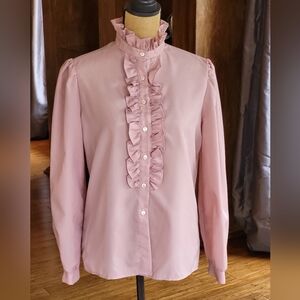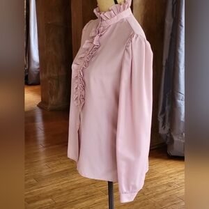 Paddy Lee vintage 70s polyester blouse in a dusty rose with a high neckline, tuxedo front, and single button cuff.