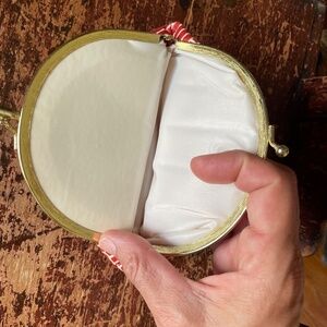 This vintage cosmetic bag has two compartments, one with an attached half-moon mirror. Brick red, cream, and old gold geometric pattern, quilted exterior. Cream fabric interior. Metal kiss lock clasp. Pristine. Approximately 5 1/2" x 6 1/2"