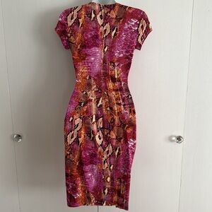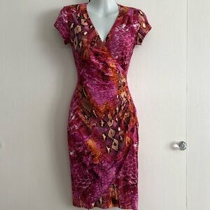 Cache Y2K Snake Print Ruched Faux Wrap V-Neck Sheath Dress Pink Mob Wife Size XS