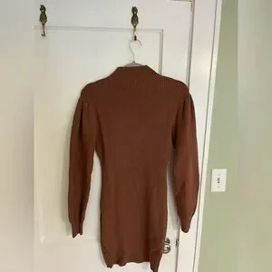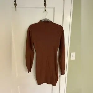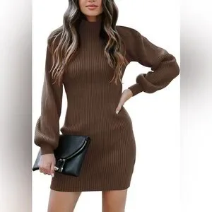 This chic brown sweater dress features a ribbed texture and a bodycon fit, perfect for casual or work settings. The mock neck and bishop sleeves add a touch of elegance, while the long sleeves provide warmth and style. Crafted from a thick knit material, it offers both comfort and a sleek silhouette.