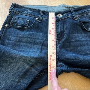 Dark wash blue denim, womens size 31x33, however, my measurements show a 34” waist and 31” inseam. Straight leg, intentional whiskering.