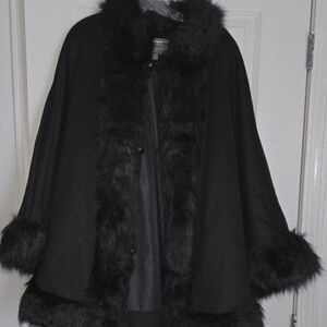 Elegant Jessica London black cape coat with luxurious fur trim. Perfect for a sophisticated look. 30 inch length. Fully lined. Size 18W-20W. Make me a reasonable offer.