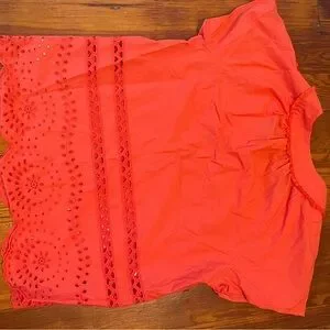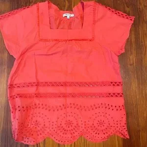 This blouse from Madewell features a boxy silhouette with short sleeves, perfect for a chic and casual look. The top is embellished with intricate eyelet lace detailing, adding a touch of elegance to its design. Its cropped length and decorative hemline make it a standout piece in any wardrobe. It is 100 percent cotton. Very lightly worn.