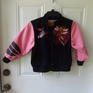JH Designs Tinkerbell girls size 6 snap front jacket, black, pink, emblems VGC