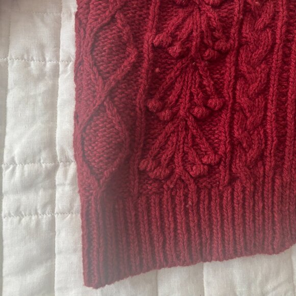 Doen Verona Cardigan in dark red. Size x-small. An adorable, fitted wool-cashmere blend cardigan with a cozy cable knit and big horn buttons. In very good condition apart from some very minor pilling here and there.