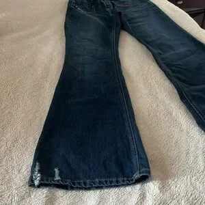 Embrace a timeless style with these blue flare jeans from Sincerely Jules, featuring a wide leg design that offers a relaxed and fashionable silhouette. The medium-dark denim wash with subtle fading and whiskering adds a touch of vintage charm, while the distressed hems provide a casual, lived-in look. Perfect for any laid-back occasion, these jeans effortlessly combine comfort and style. I did tailor the waist in to get rid of gap so it fits a 27” waist perfectly now.