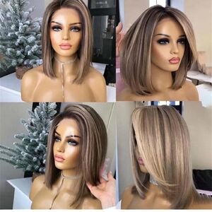 Side Part Ash Brown Highlight Short Bob Wigs Synthesis Straight Wigs Without Bangs