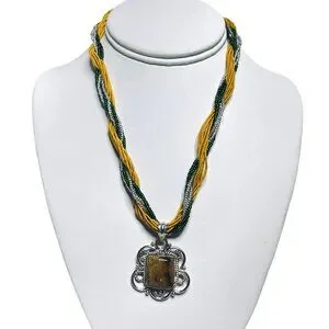 12 Strand Green & Silver Seed Bead Necklace With Jasper Pendant (5891)