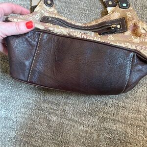 Turn heads with this rare UGG Signature Madison handbag in a beautiful tan and chocolate brown colorway. Featuring the iconic UGG logo pattern with floral accents, this bag is both stylish and functional.