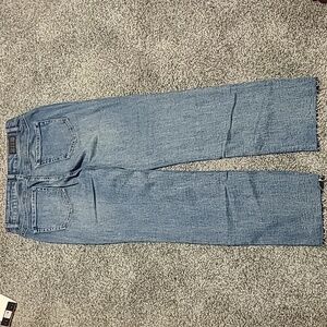 These Kenneth Cole high rise jeans in a classic blue hue offer a timeless look with their straight-leg cut and subtle fading. Crafted for comfort and style, they are perfect for everyday wear. They are a size 6. these are new with tags. I thought I would keep them, so I ripped the tags off. never worn. also it's a 27" inseam
