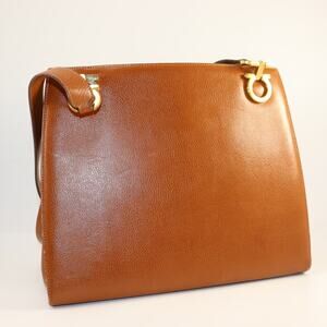 Authentic Salvatore Ferragamo vintage shoulder bag in structured brown leather with gold-tone Gancini hardware. Features double flat straps, protective metal feet, and a spacious dual-compartment interior with zip pocket and branded black jacquard lining. Made in Italy. Approx. 10.5" wide x 9.5" tall x 4.5" deep. Clean interior with minor wear on corners—see photos. Normal wear on hardware but still beautiful! Elegant and timeless piece for everyday or professional use.