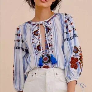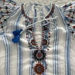 This relaxed blouse by Antik Batik features a striking graphic design in blue and white, complemented by a stylish tie front. The 3/4 sleeves add a touch of elegance, making it perfect for both casual and chic occasions. Stunning white and blue striped embroidered tunic by Anton Batik sold At Anthropologie, paid $220