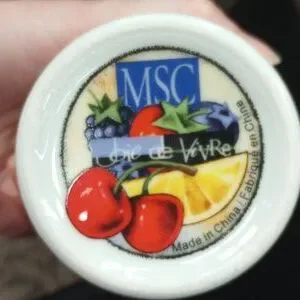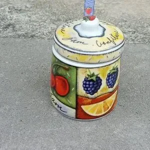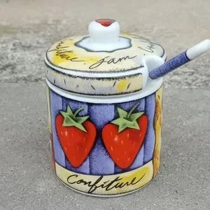 Decorative ceramic sugar bowl with a colorful fruit pattern: strawberries, blueberries, cherries, an orange slice, etc. Lid and spoon have strawberries as well. 3.5 inches tall with lid. 2.5 inches tall without lid. 2.5 inches in diameter. Good condition. No damage. If you like strawberries, I have many other strawberry items, so please check them out!