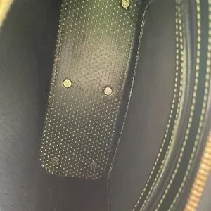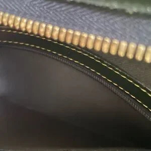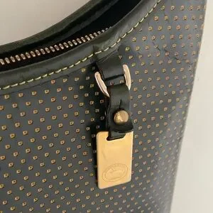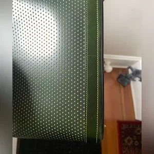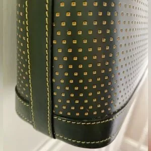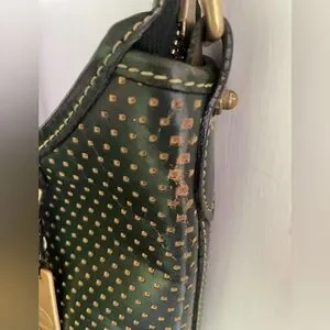 EUC! See photos. Vintage bag, clean, original owner, no perfumey smell. Classy green leather w/ perforated design, solid bottom & strap has gold hardware, brand engraved front plate, top zipper, gold feet on bottom. Inside has a zipper pocket, roomy & clean. From non smoking no heavy scent home.