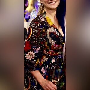 Step into elegance with this FARM Rio sundress, featuring a vibrant red and yellow floral print. Designed with a flattering V-neckline and graceful bishop sleeves, this midi dress is perfect for wedding guest and cocktail occasions. Its flowing silhouette and artistic pattern make it a standout piece for any event. 100% Viscose