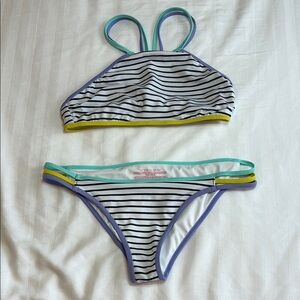 Chic striped bikini set. Athletic top with double colorful straps black and white body. straps with matching strappy cheeky bottoms colorful trim. Perfect for beach days.