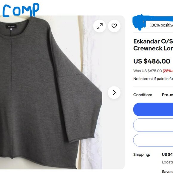 --The Story: I found this at a thrift store, and I fell in love with the weight of it. I wanted a thick wool sweater. But when I got home and searched the brand, I found out it's high end fashion...and I'm super poor. I don't have anywhere to wear it, and the style isn't compatible with my lifestyle (couldn't try it on in-store). I debated keeping it since it's my first ever fashion piece...but my situation keeps getting worse and worse, so I need to be practical and sell it. I reached out to local consignment shops and they were rude or ignored me (I had no idea how that world worked). Priced lower than comp because of the small hole in hem. I think it was originally sold at Holt Renfrew (care tags in Eng and Fr).
