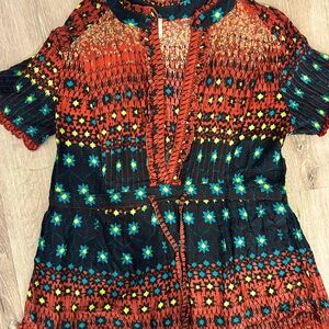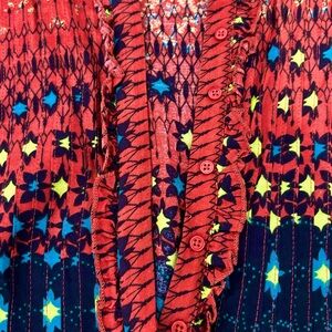 Charming maxi dress with a vibrant floral pattern. Features a mix of red, blue, and yellow hues. Perfect for a bohemian look. Super cute with lace bra and in a low cut summer vibe.
